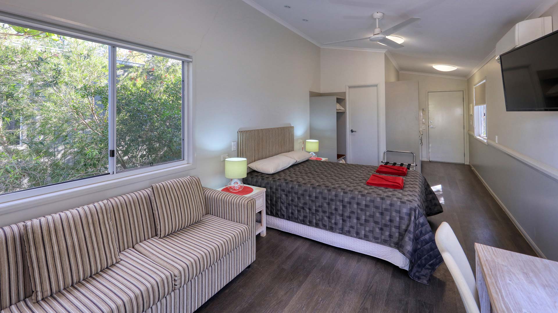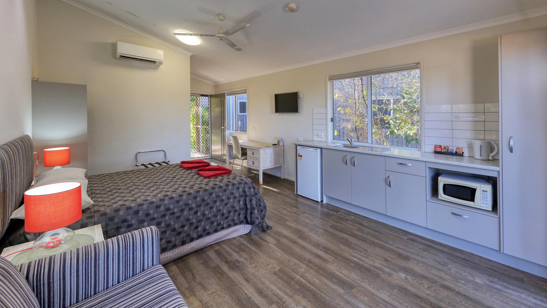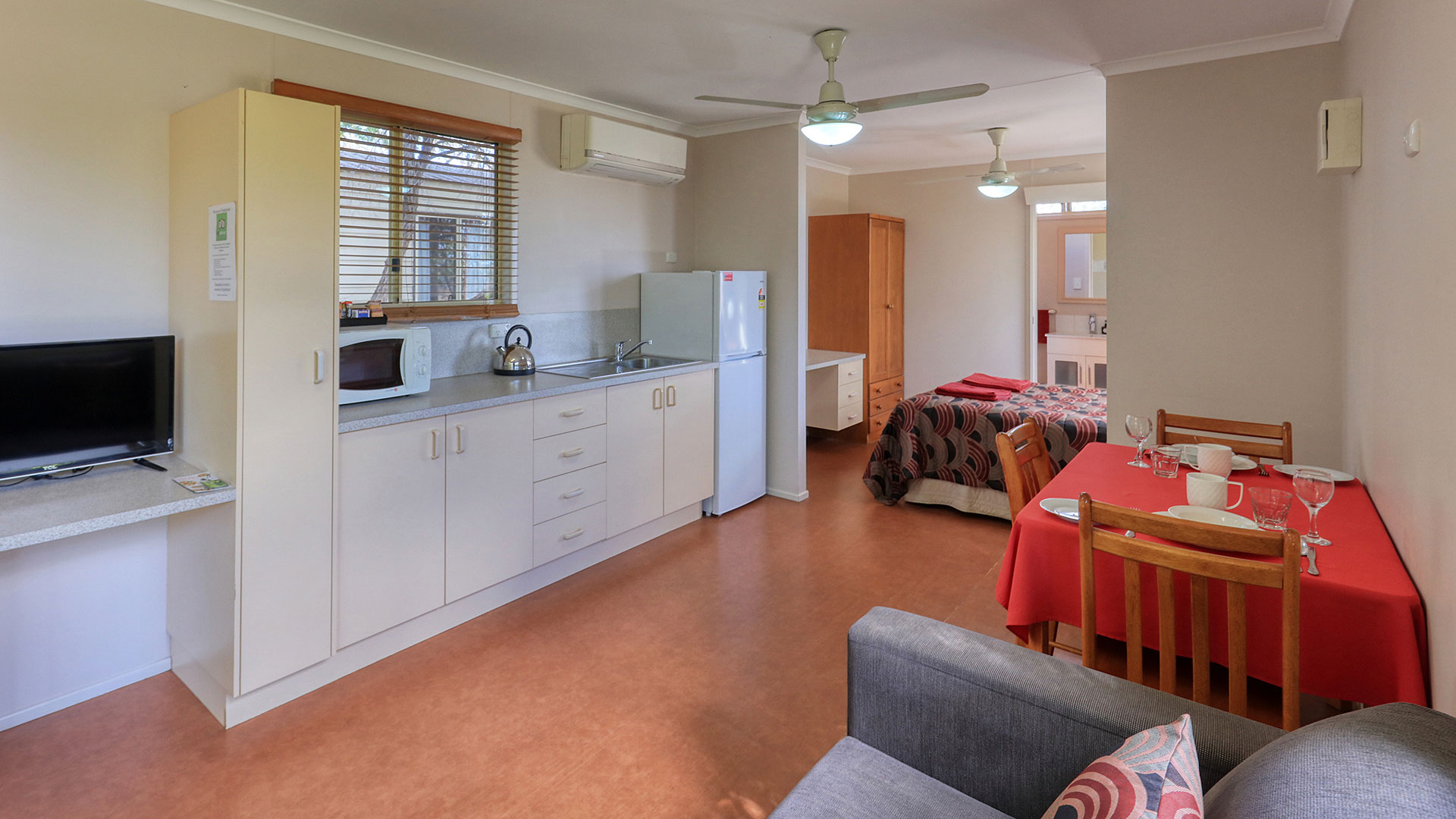 The cabins typically include an open-plan layout, with split-system air conditioning and fans.  Compact and functional kitchenettes include tea and coffee making facilities, a toaster, a microwave and refrigerator.  The bathrooms consist of a shower, toilet and bathroom vanity.  Linen and towels are supplied, and the cabins are serviced.  Each cabin has various configurations of private verandas, which offer additional, undercover seating or dining options.